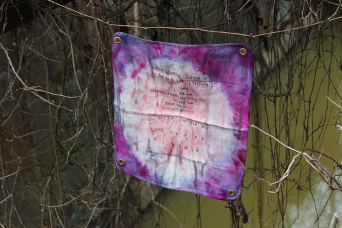Evidence of Process Banner - release liner from vinyl stencil cutting, dye, reflective binding, embroidery thread, grommets. Entry for Miracle Seltzer Artist Grant 2021